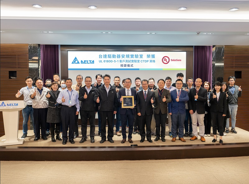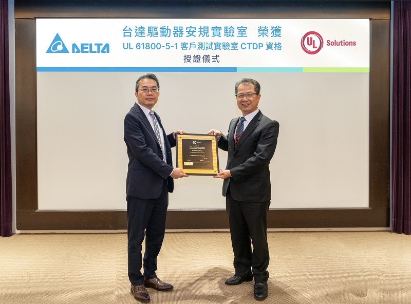 Delta’s Taoyuan-based safety lab has obtained UL 61800-5-1 CTDP authorization on testing drives. Andy Liu (Left), general manager of Delta’s IABG received the certification.